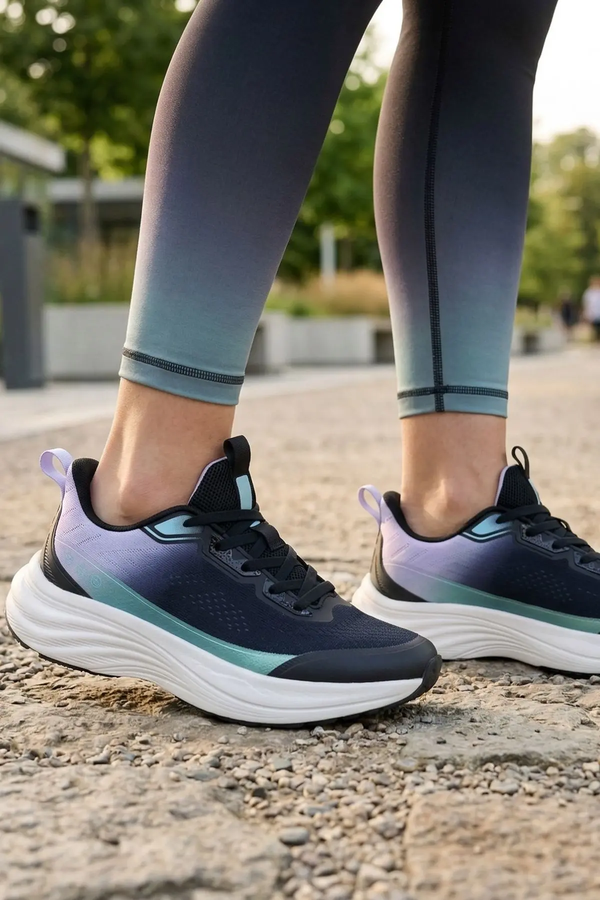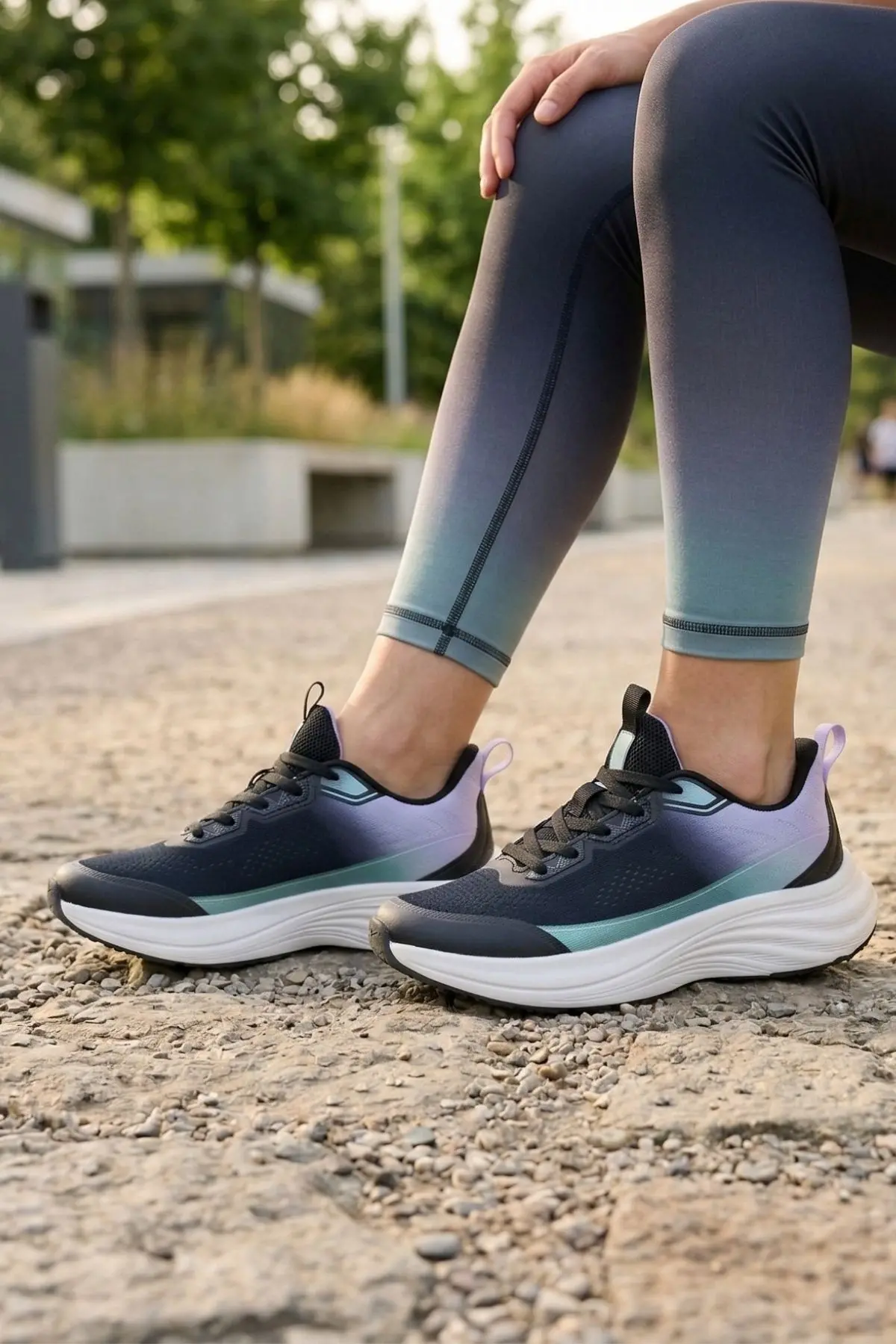 Tasarımda Renklerin Dansı Ayakkabının dış yüzeyinde yer alan lacivertten mistik lila ve ferah turkuaza uzanan degrade (geçişli) tasarım, stilinize modern bir dokunuş katar. Nefes alabilen özel file dokusu, ayağınızı terletmeden kavrar ve her adımda tazelik hissi verir.