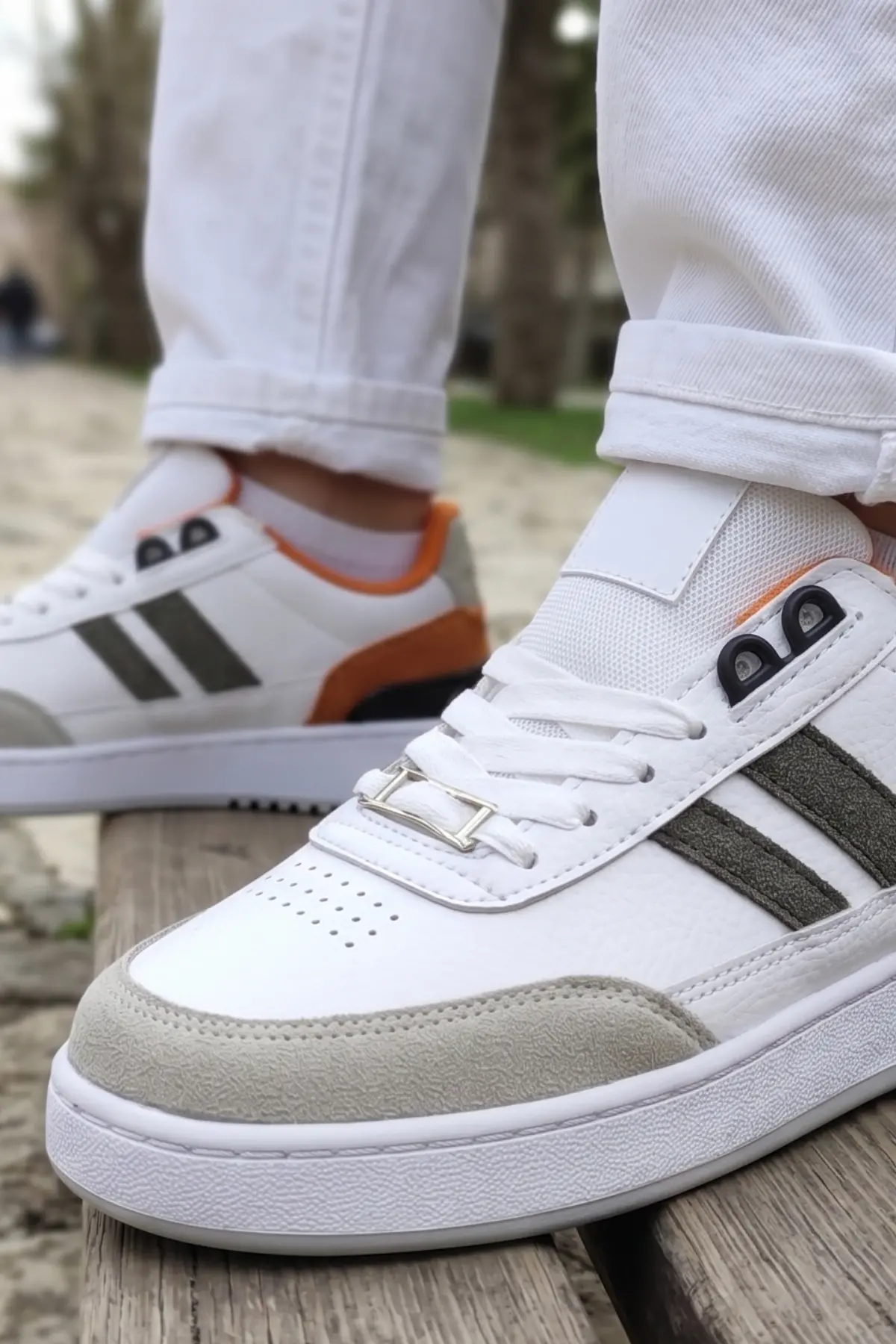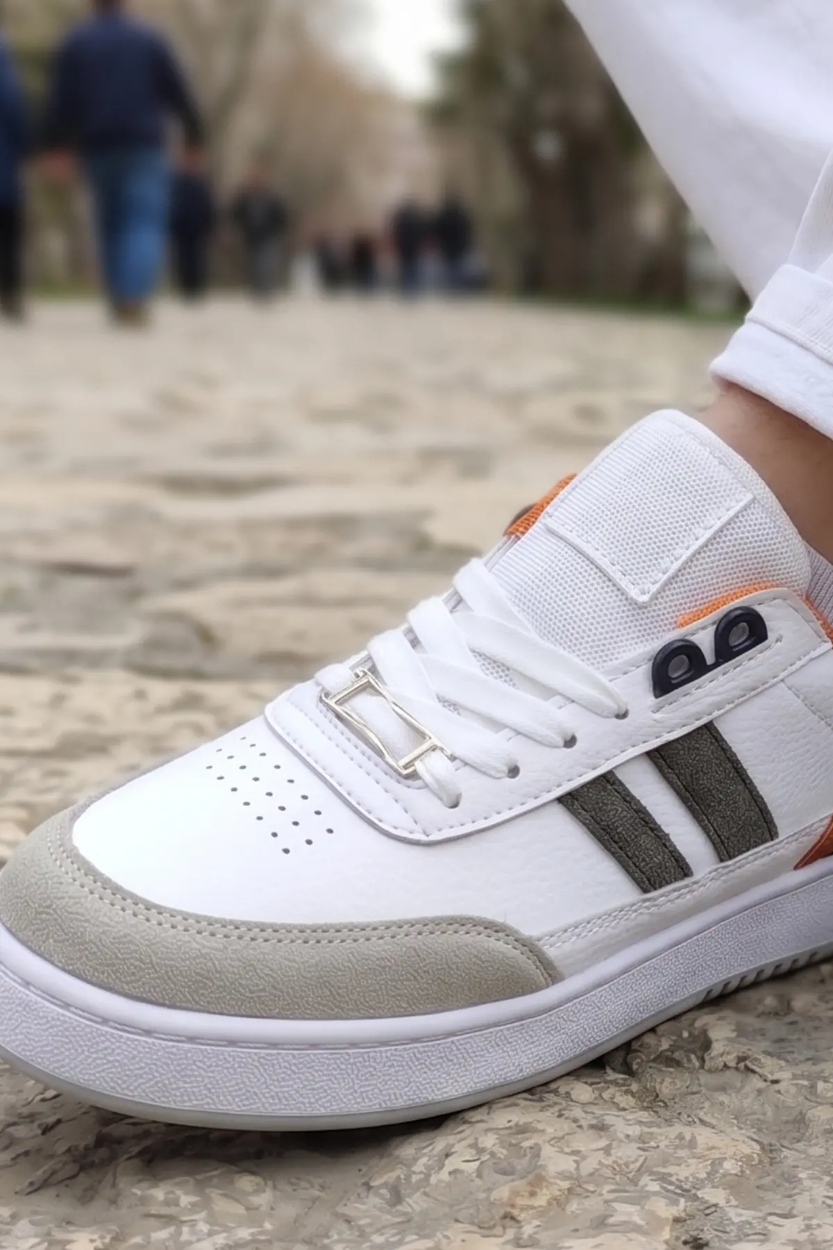 Bu özel tasarımın kalbinde yer alan premium beyaz deri dış yüzey, gri süet burun paneliyle birleşerek dayanıklılık ve estetiği bir arada sunuyor. Ayakkabının yan kısımlarında yer alan antrasit çizgiler asil bir duruş sergilerken, topuk ve iç astarda kullanılan canlı kehribar (amber) rengi, en sade kombinlerinize bile anında enerji katacak.