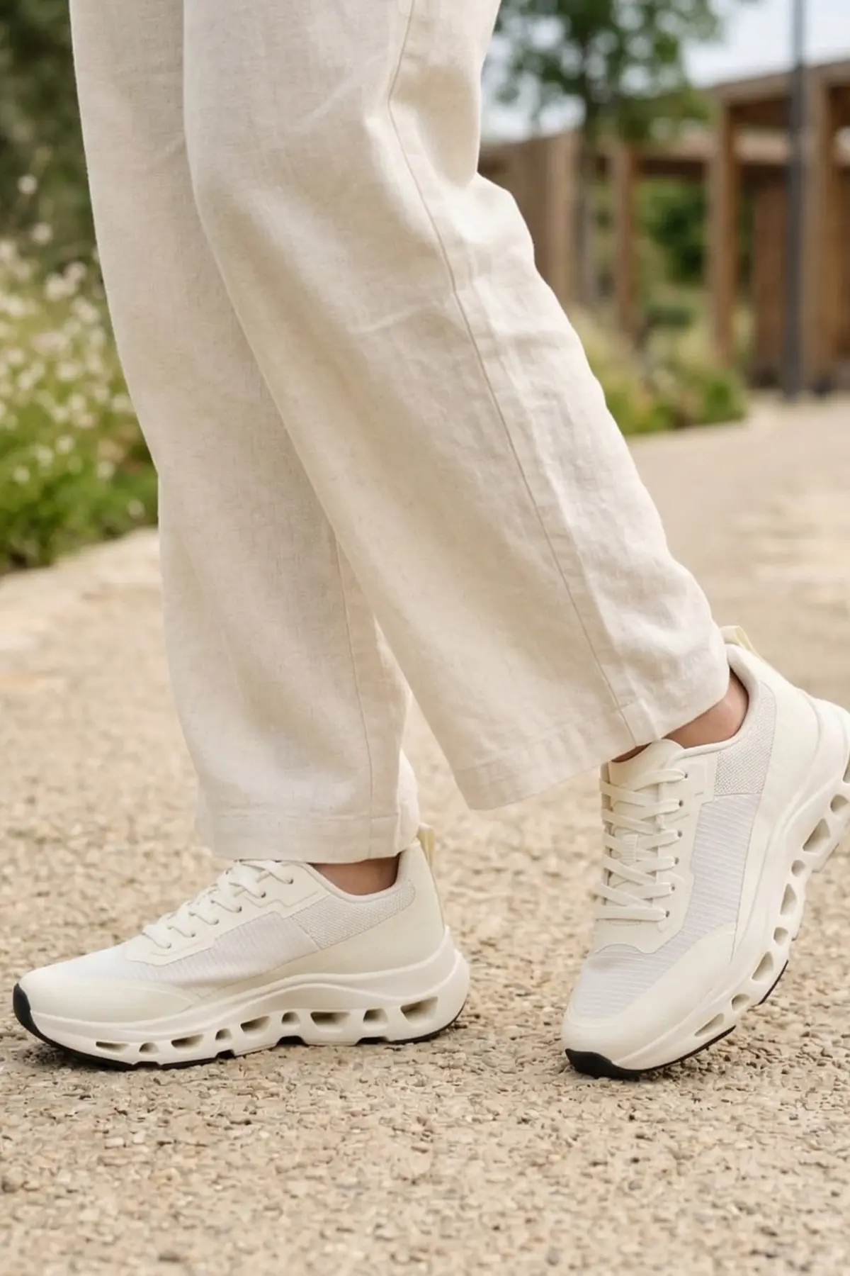 • Havadar Kapsül Taban: Beyaz orta tabanda yer alan stratejik boşluklar, her adımda darbe emici bir yastıklama sunarak eklemlerinize binen yükü azaltır.